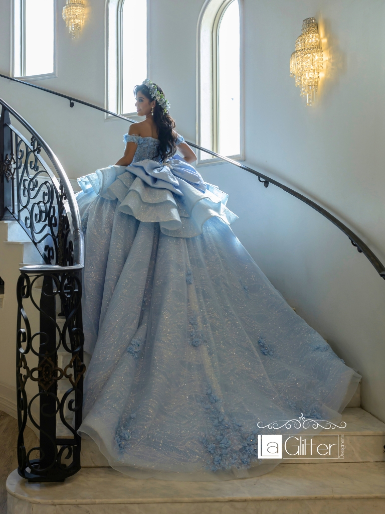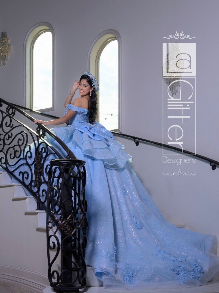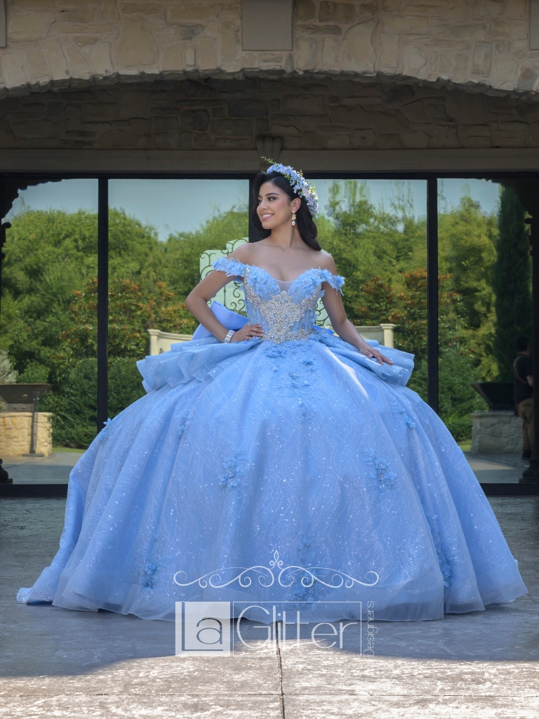 The GL2061 quinceañera gown from LaGlitter Designers in Dallas, Texas is the definition of freshness and elegance. Designed in a sparkling sky blue tone, this gown features a sweetheart neckline corset with off-the-shoulder straps, adorned with silver beading and delicate 3D floral appliqués for a romantic yet modern touch. The voluminous shimmering skirt flows into a majestic train decorated with floral details, while structured pleats at the back add movement and sophistication. A timeless princess design that blends elegance with modern trends, perfect for any Dallas quinceañera celebration.