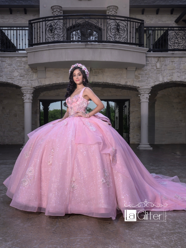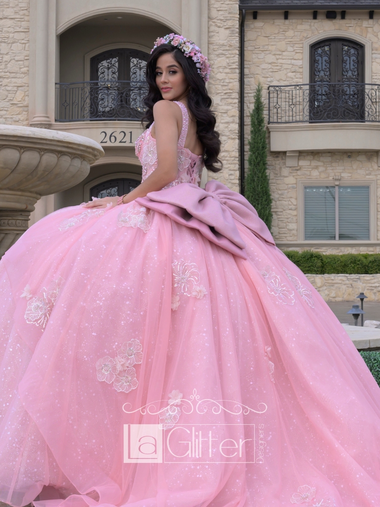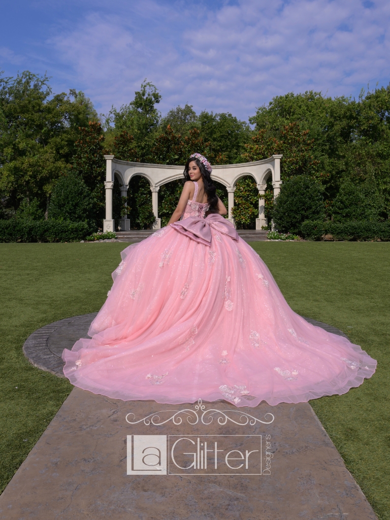 The GL2062 quinceañera gown from LaGlitter Designers in Dallas, Texas is a dream come true for the quince girl who desires elegance and sweetness on her big day. Designed in blush pink, this gown features a fitted corset with delicate straps, adorned with floral lace and sparkling bead appliqués. The voluminous shimmering tulle skirt flows into an extended train, highlighted by embroidered floral details. At the back, a large trendy bow adds romance and modern flair, making this gown the perfect blend of charm, sophistication, and glamour.