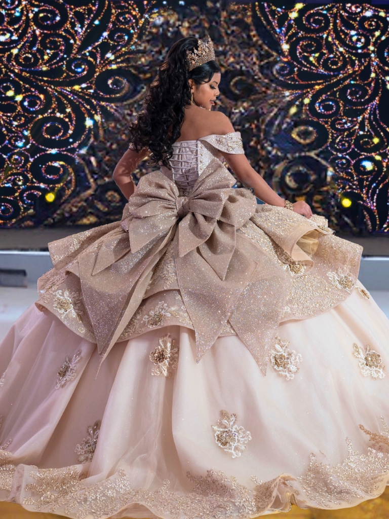 The full glitter tulle ball gown skirt is layered with shimmering tulle and floral appliqués embellished with crystals, adding luxury, texture, and graceful movement. A dramatic oversized glitter bow at the back completes the majestic princess look, perfect for any Dallas quinceañera who wants to shine on her special day.