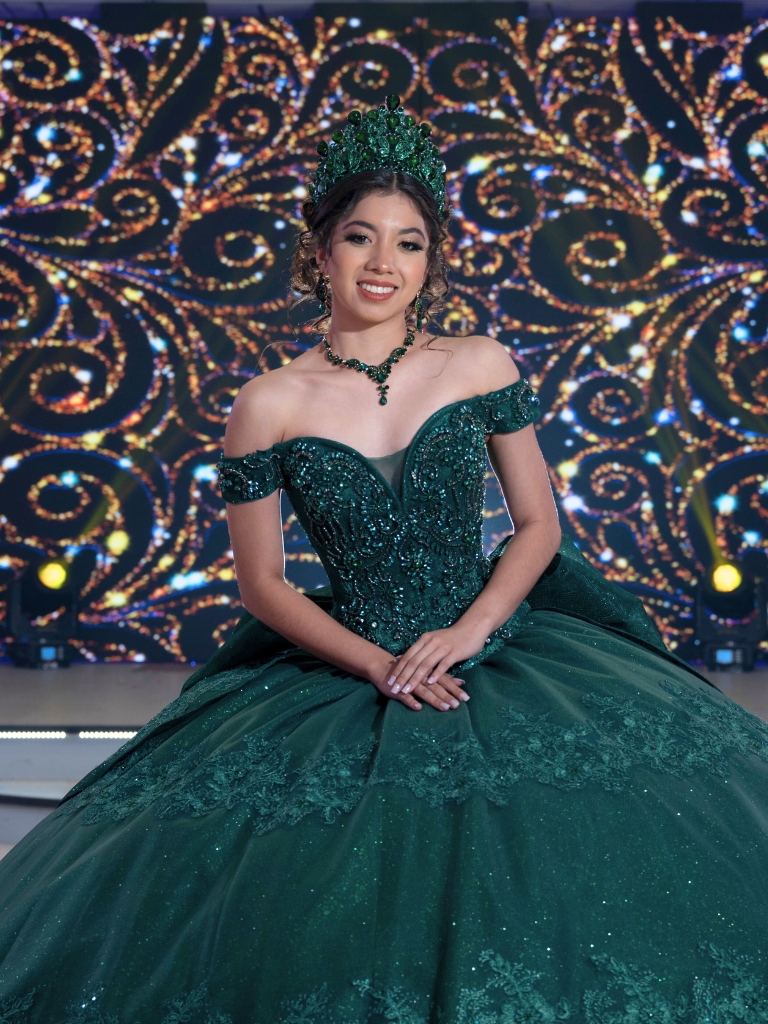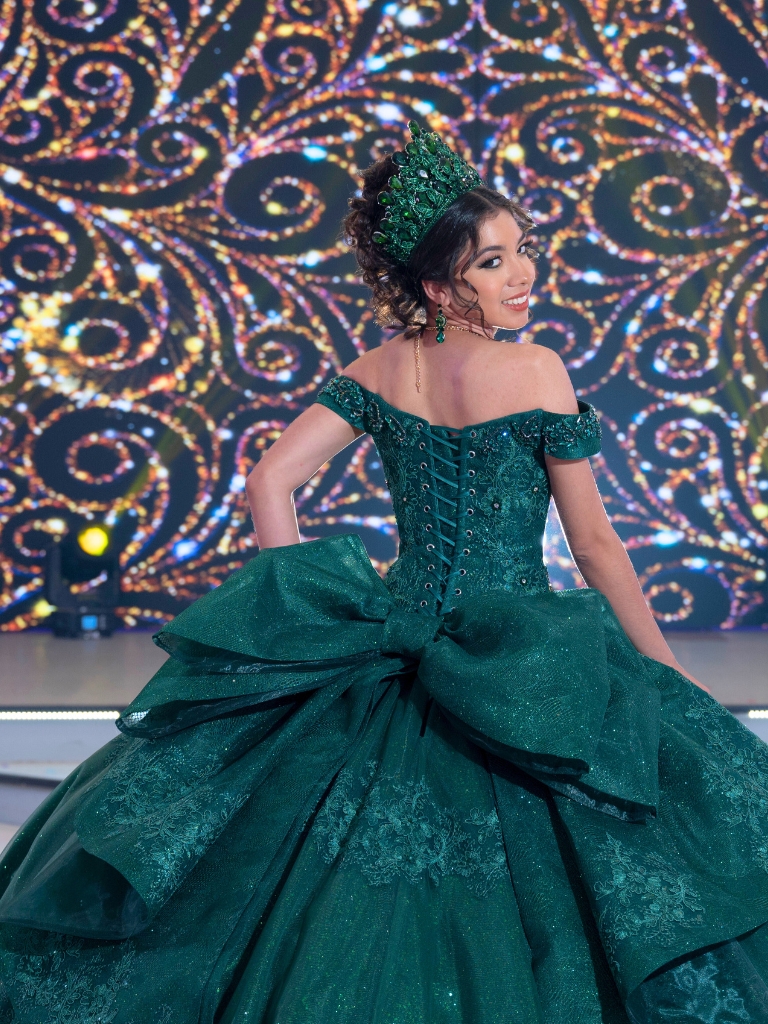 This emerald green quinceañera gown from LaGlitter Designers in Dallas, Texas combines timeless elegance with a magical princess touch. The beaded corset bodice with an off-the-shoulder sweetheart neckline is adorned with sparkling appliqués, adding shimmer, depth, and sophistication. The voluminous glitter tulle skirt with floral embroidery and the oversized glitter bow at the back make this gown a true show-stopper for any Dallas quinceañera celebration.