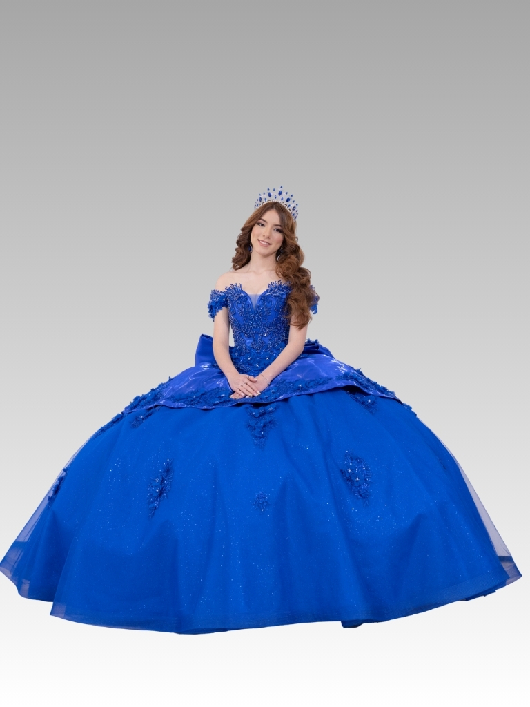 Royal Enchantment Bodice: Featuring an off-the-shoulder design with subtle sheer detailing at the neckline and handcrafted draping that enhances the silhouette. It is adorned with exquisite 3D floral appliqués and silver and lavender beading that seem to bloom from the design.